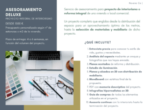 Así que, consciente de las distintas necesidades de cada cliente, pongo a tu disposición diferentes servicios de asesoramiento de decoración para que elijas el que mejor se adapte a tu proyecto.